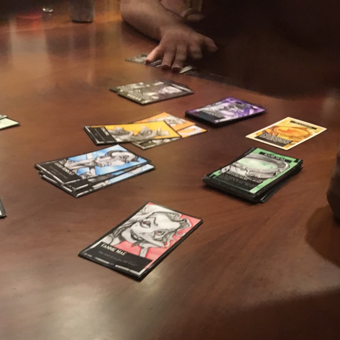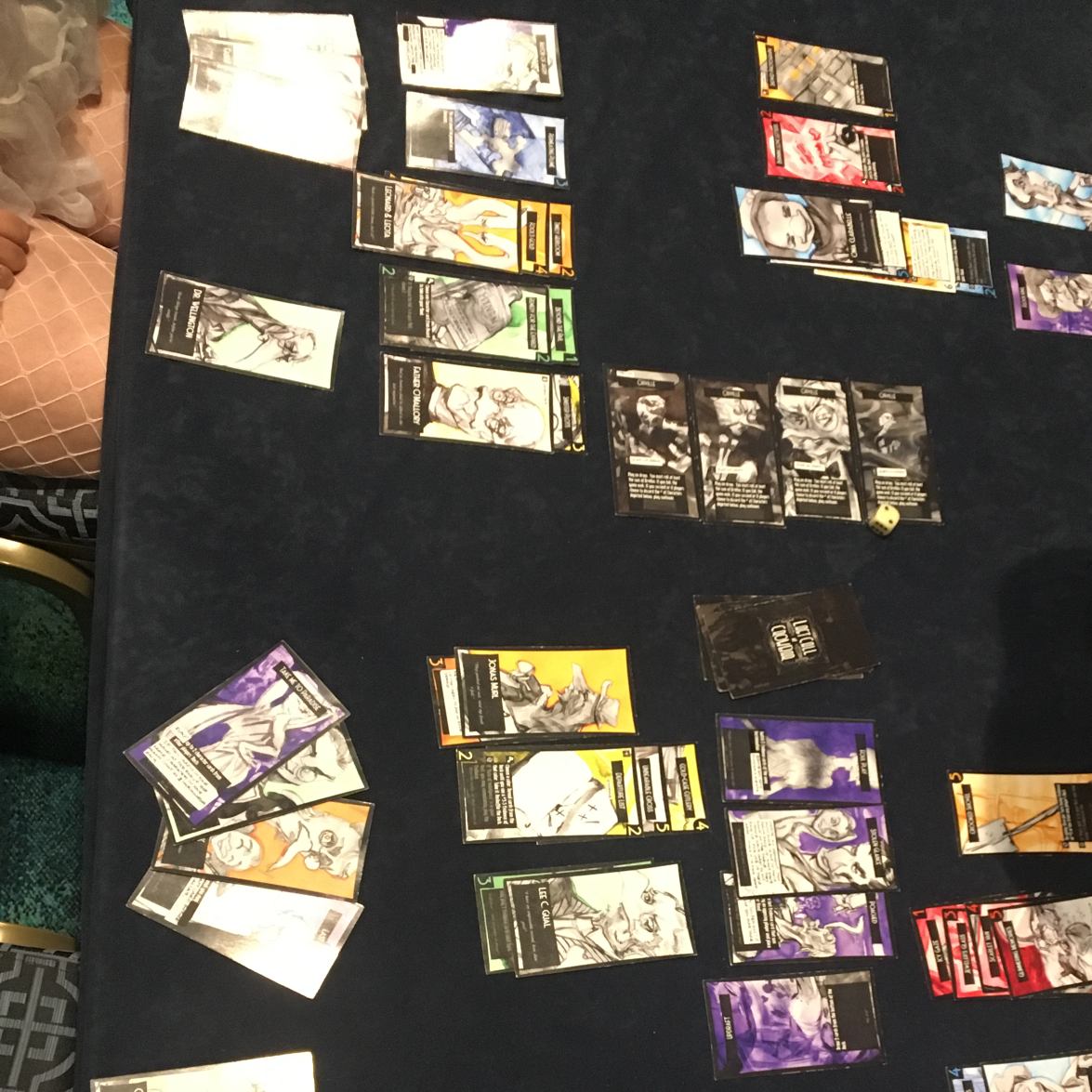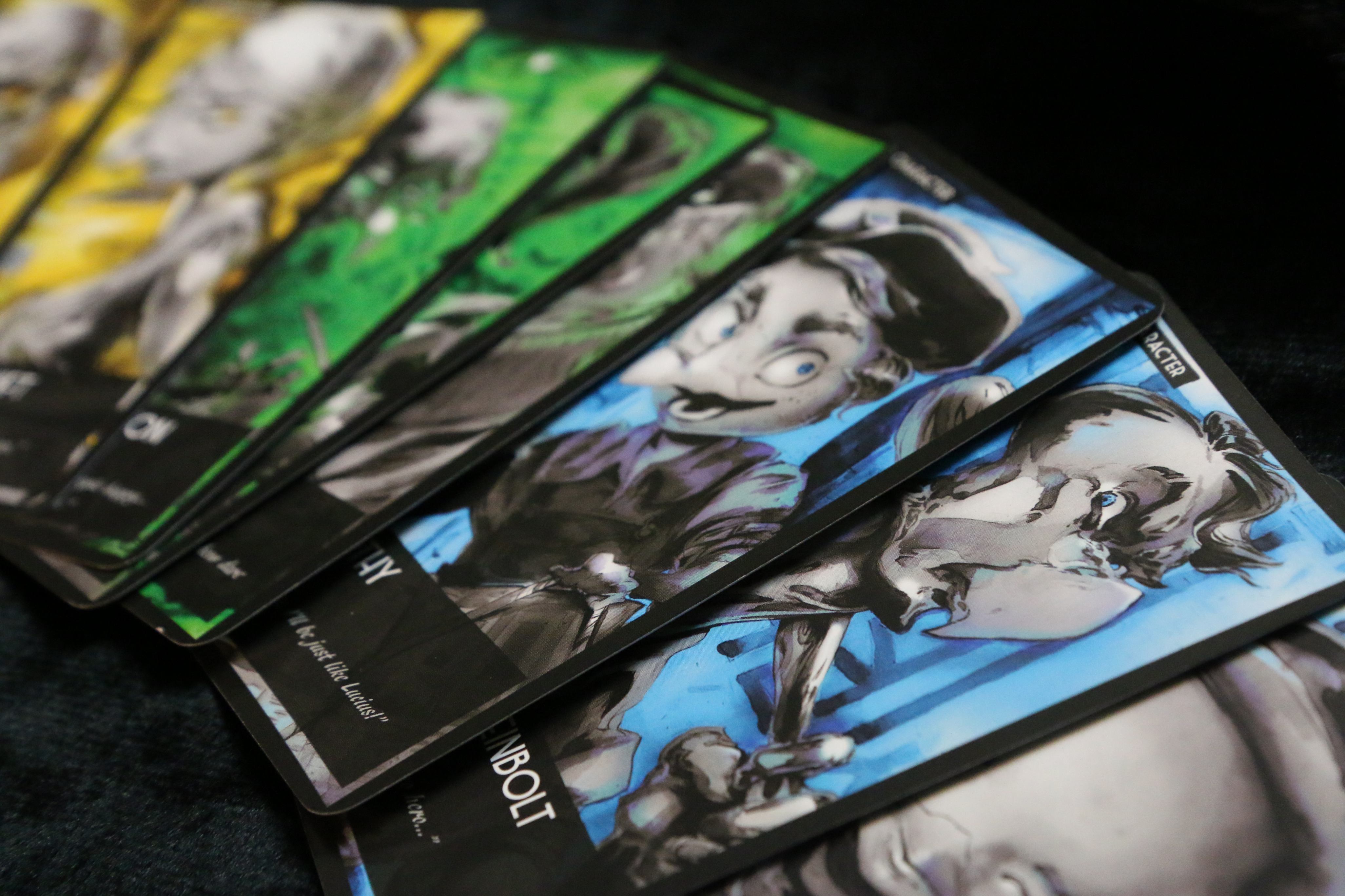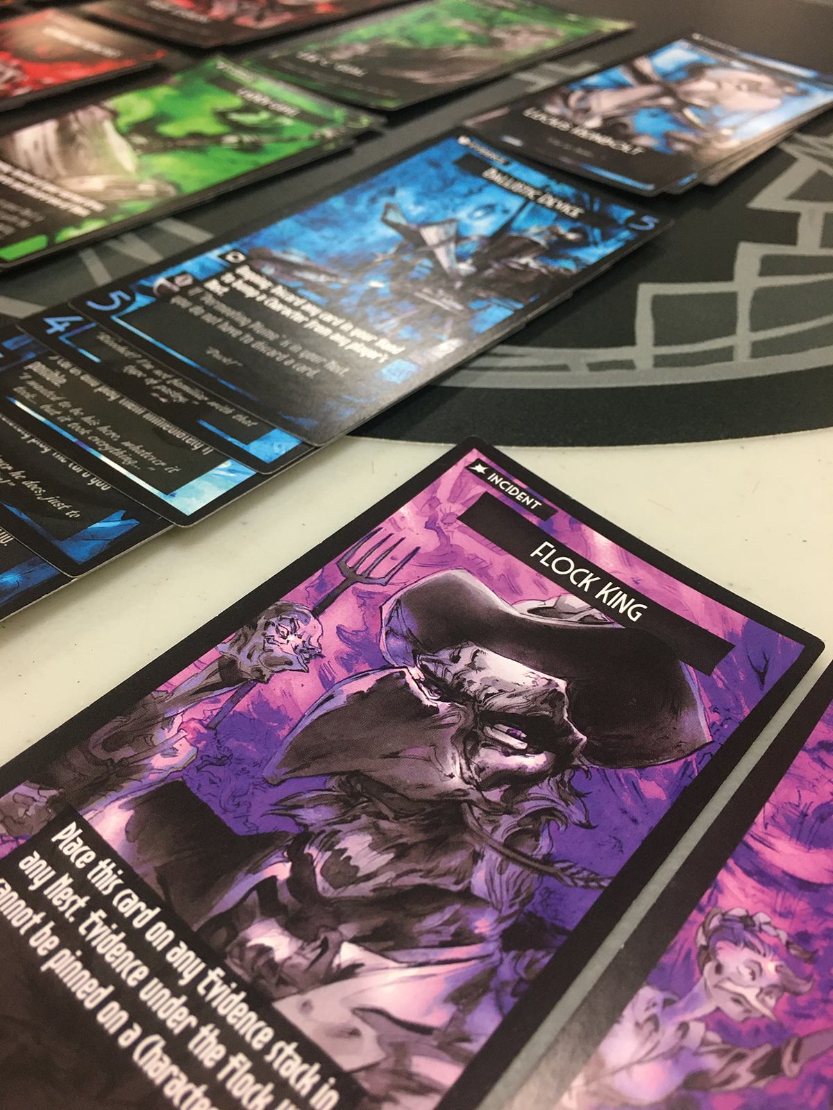 Hand inked illustrations on 60 cards showcase 5 unique crime scenarios in a seedy crime noir world.